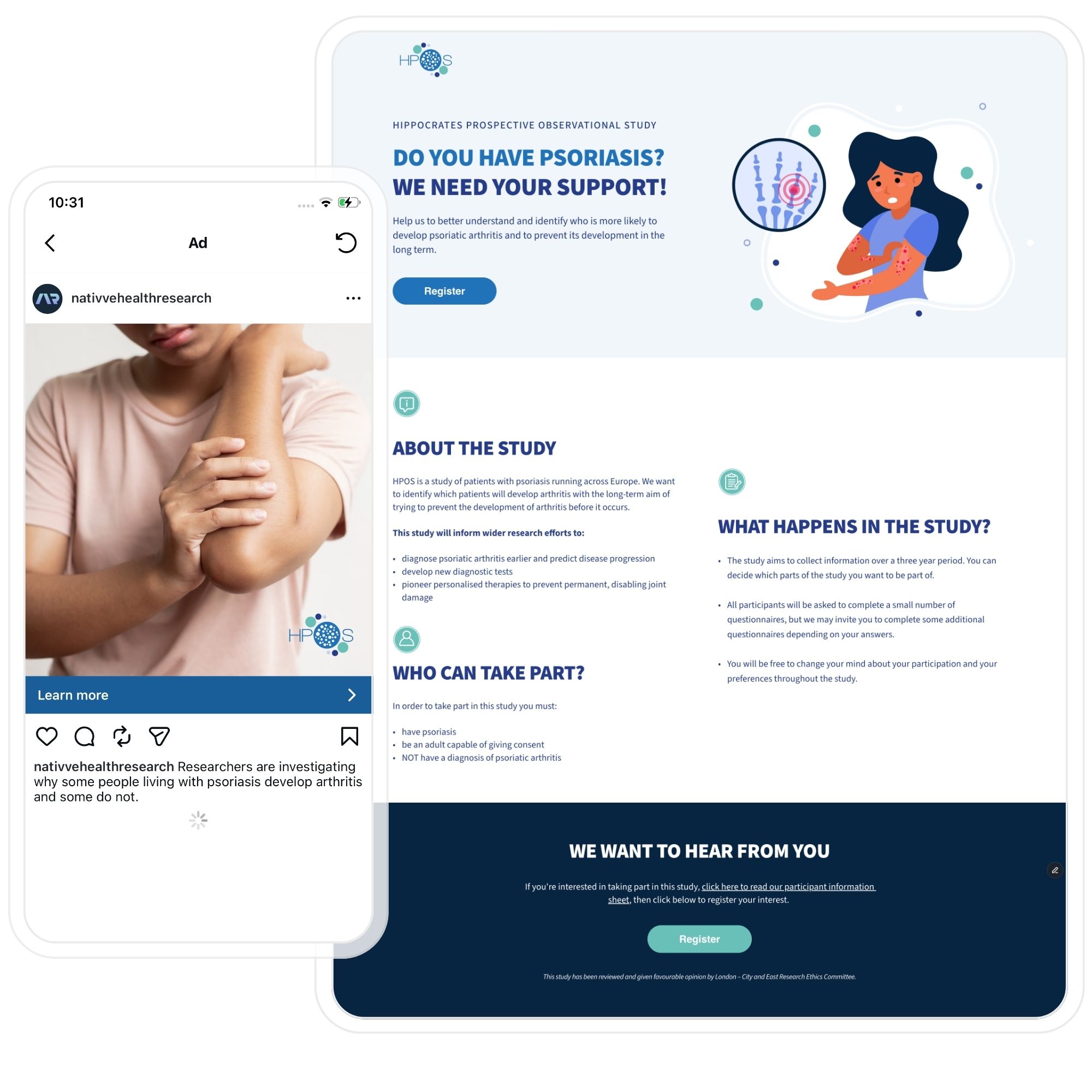 We used insights from earlier HPOS campaigns to inform our approach for the Dublin based research team. We elected to run ads on Facebook and Instagram, as we've seen these be highly effective platforms for dermatology trial recruitment.